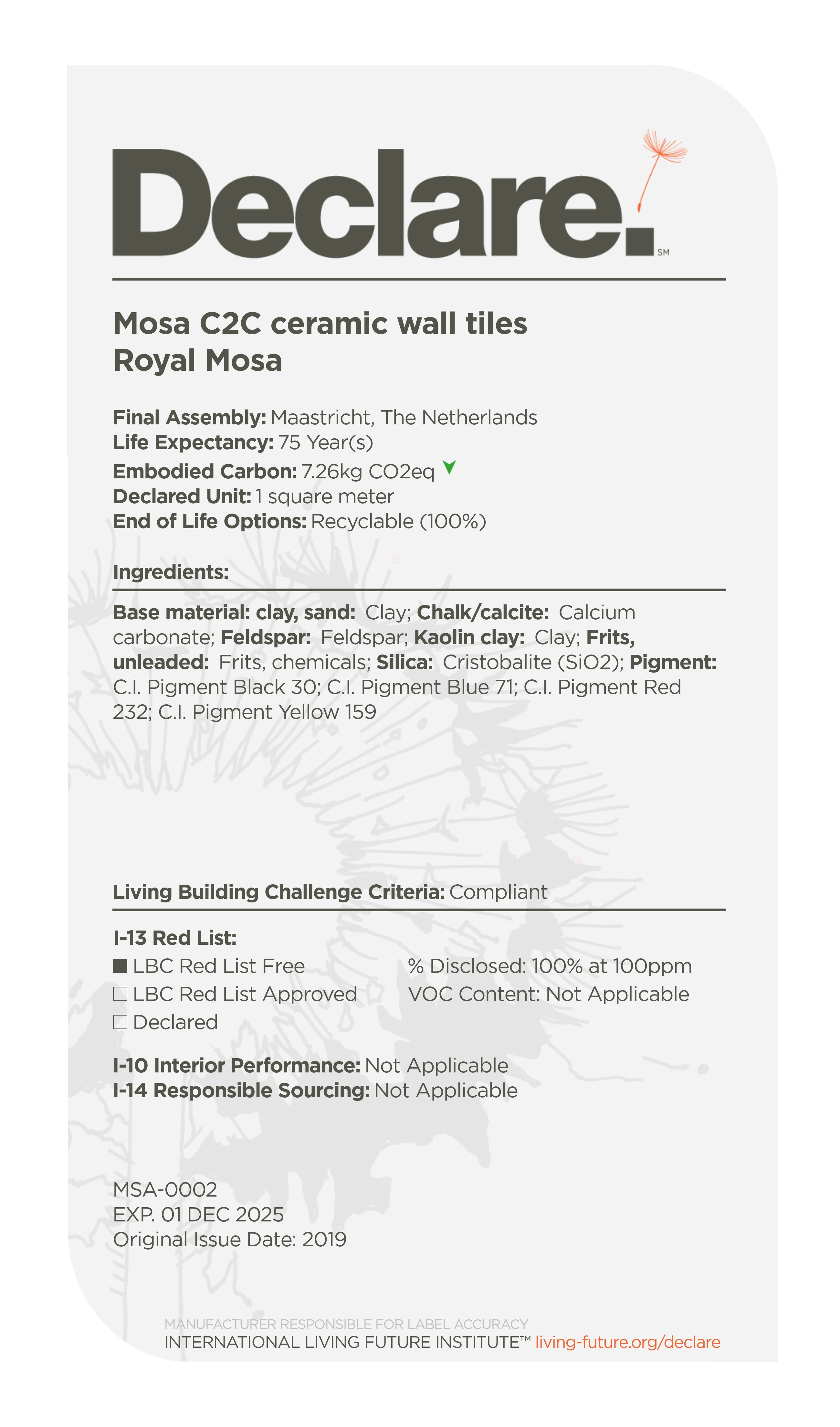 Mosa products are Declare Red List Free, ensuring the ingredients in our tiles pose no risk to humans or our environment.